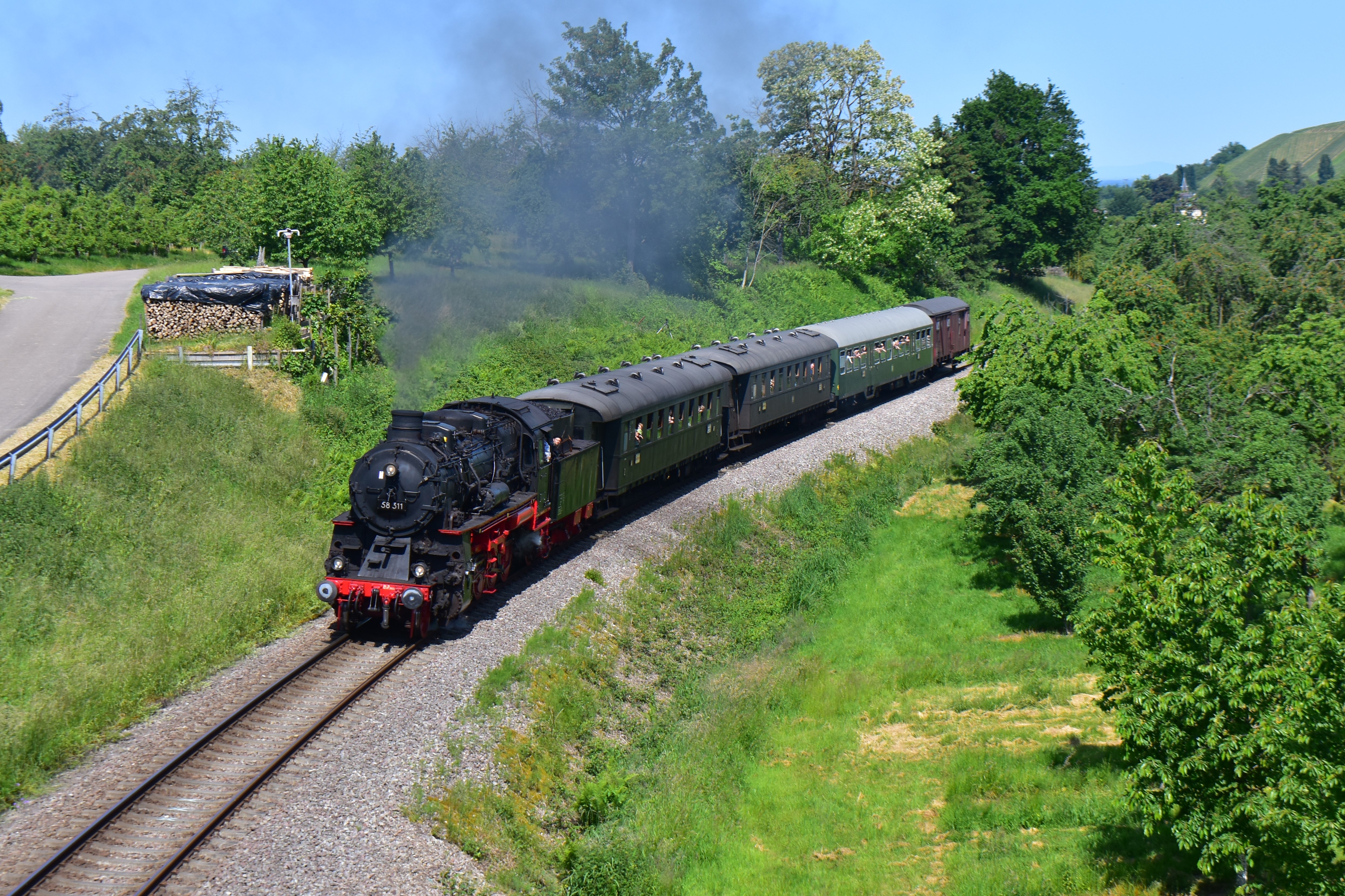 … diese haben übrigens Tradition im Zusammenhang mit Rotwein und Kappelrodeck. Das historische Foto aus unserem Archiv zeigt einen der zahlreich stattgefundenen Sonderfahrten in den 70er Jahren. Eigens zum Thema Rotwein und Kappelrodeck! Interessant auch der Vergleich zum aktuellen Foto aus fast der exakt gleichen Perspektive. Lasst uns also an die Tradition anknüpfen mit Dampfzug und Weinfest – mit dem AEV zur Winzer-Kirwi nach Kappelrodeck!