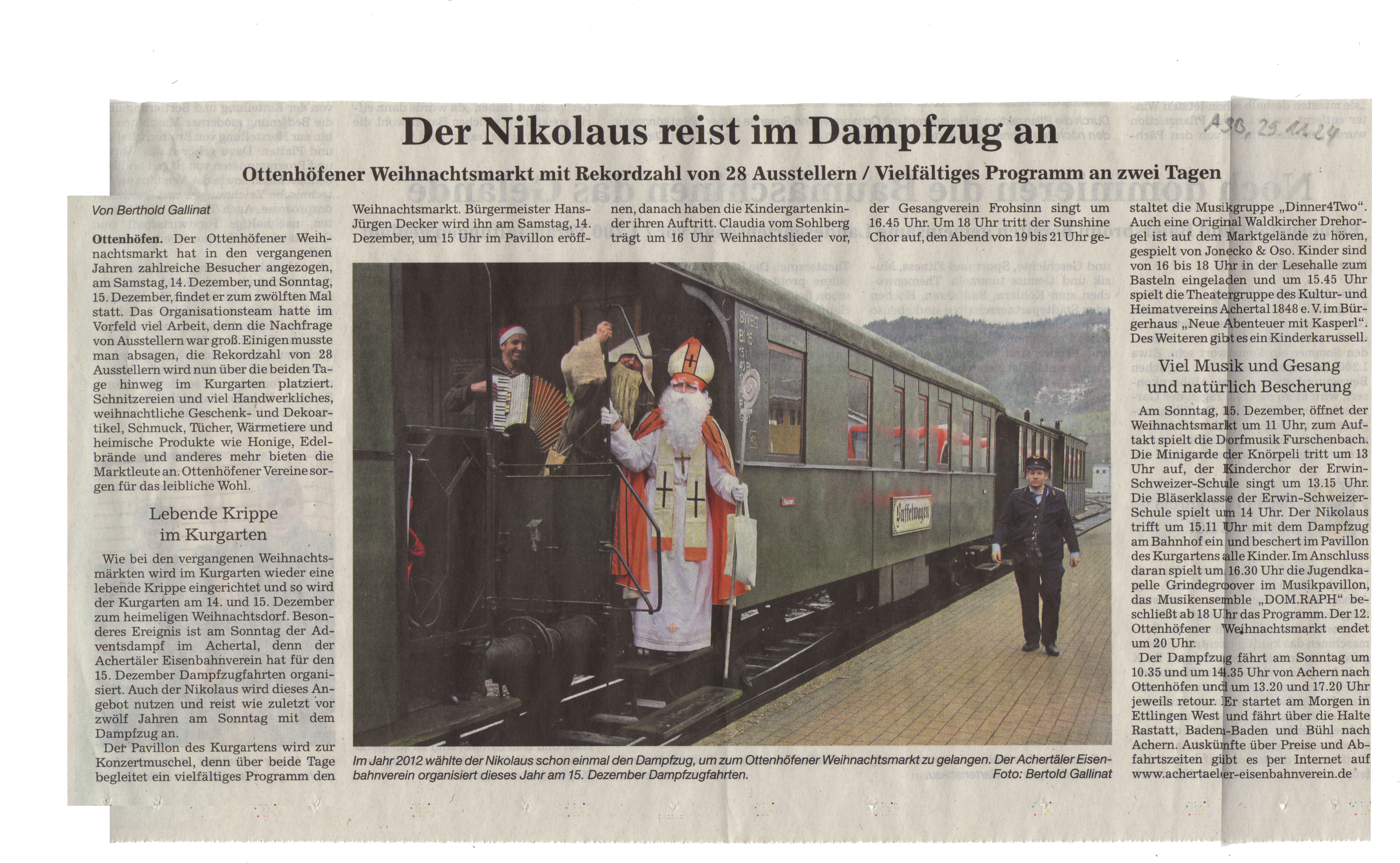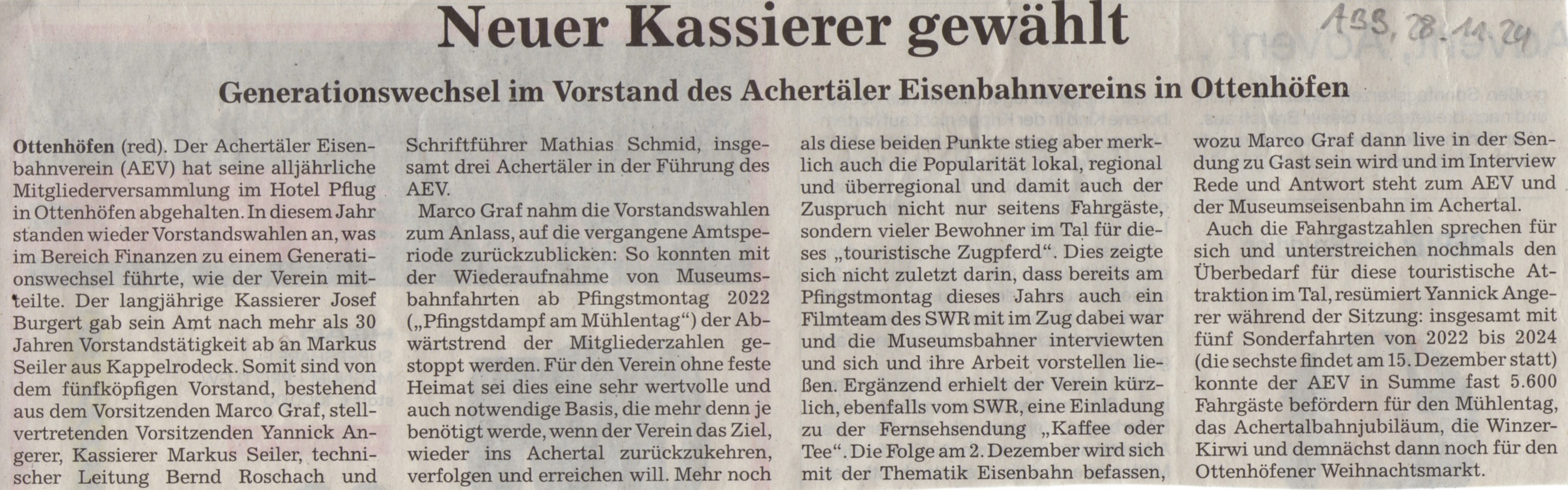 Dieses Mal hat unser langjähriger Kassier, Josef Burgert, die wohlverdiente Rente im Ehrenamt begonnen und nach über 30 Jahren Vorstandstätigkeit seinen Posten an Markus Seiler aus Kappelrodeck abgegeben. Die Vorstandschaft besteht damit aus drei Achertälern (1./2. Vorsitzender und Kassier). In der Presse wurde u.a. darüber berichtet. Ebenso ist der Weihnachtsmarkt in Ottenhöfen mit dem nächsten Dampfzug ein beliebtes Thema in den lokalen Zeitungen: