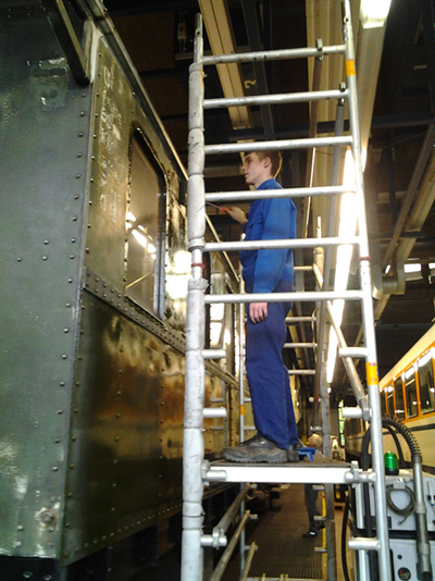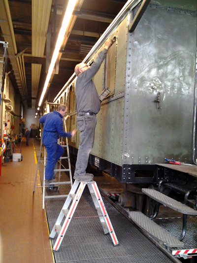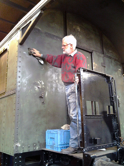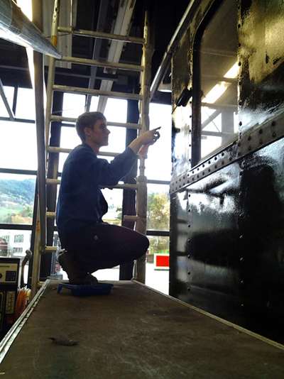 Den Außenanstrich hat die Sonne im Laufe der Jahre ausgebleicht. An den Seitenwänden, dem Rahmen und an beiden Plattformen hat der Rost deutliche Spuren hinterlassen. Rahmen und Seitenwände wurden inzwischen komplett abgeschliffen und entrostet. Demnächst werden Seitenwände und Rahmen neu lackiert. Der größte Teil des Dachs ist bereits mit Weißaluminium gestrichen. An einigen Stellen muss dort noch etwas nachgebessert werden.